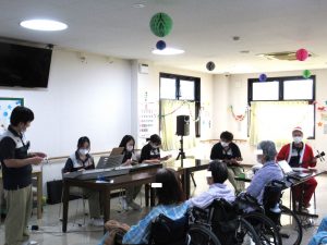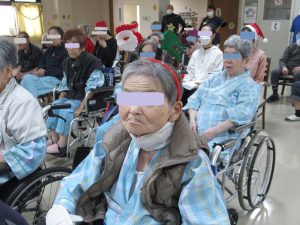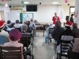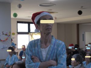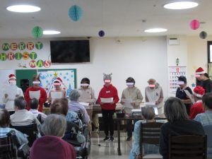 リハビリテーション室のスタッフが一人ひとり楽器を手に取り、「きよしこの夜」を演奏しました。ピアノ、鉄琴、ウクレレ、三線、トライアングル…と、音色は実にバラエティ豊か。楽しんでもらえたでしょうか?