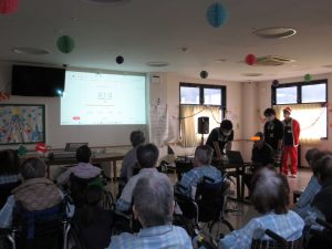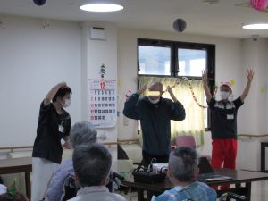 患者さんとスタッフがペアで協力してジェスチャーを行い、観客(見ている全ての患者さん)が、何のジェスチャーかを当てるゲーム。多く正解を導き出せたペアが優勝です。