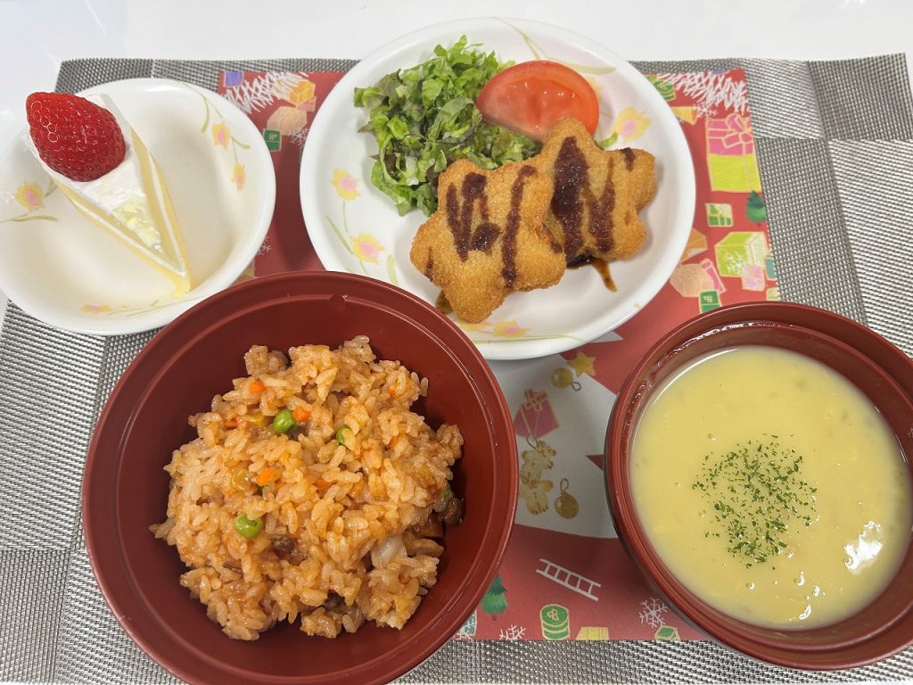 クリスマスということで、メニューはチキンライス、コロッケ、コーンスープ、ショートケーキです。