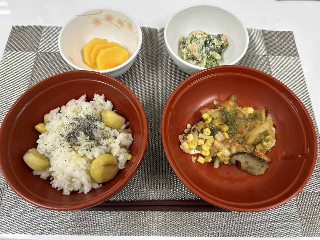メニューは、栗ご飯、秋鮭のちゃんちゃん焼き、青菜のからしマヨ和え、柿です。栗ご飯は栗がたっぷり入っていて、患者様にも大変ご好評をいただきました。